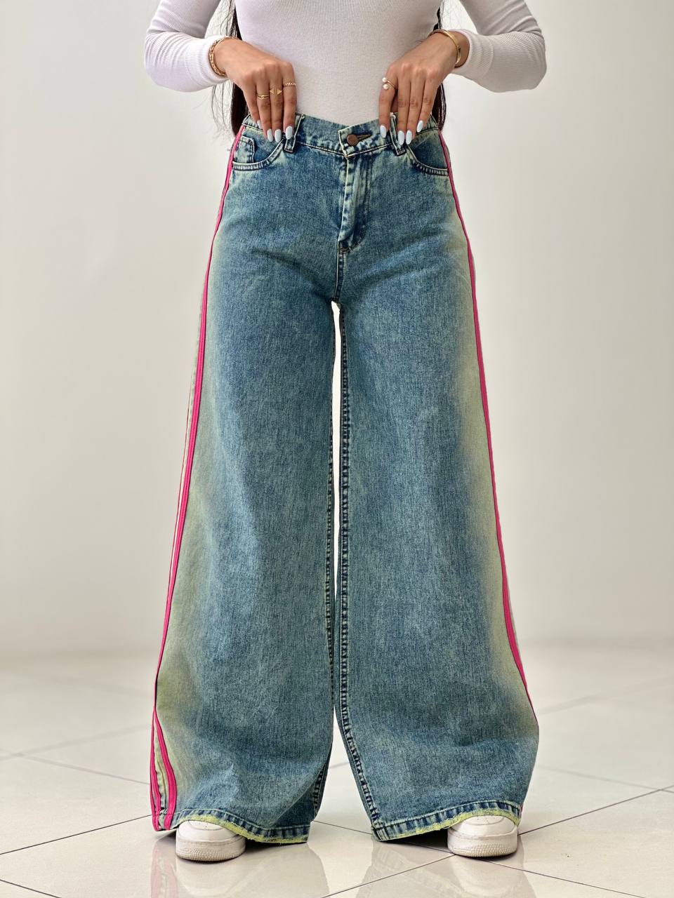 خرید شلوار فول بگ زنانه جین با نوار آدیداسی و کمر پشت کش. راحت، اسپرت و مناسب استایل خیابانی.